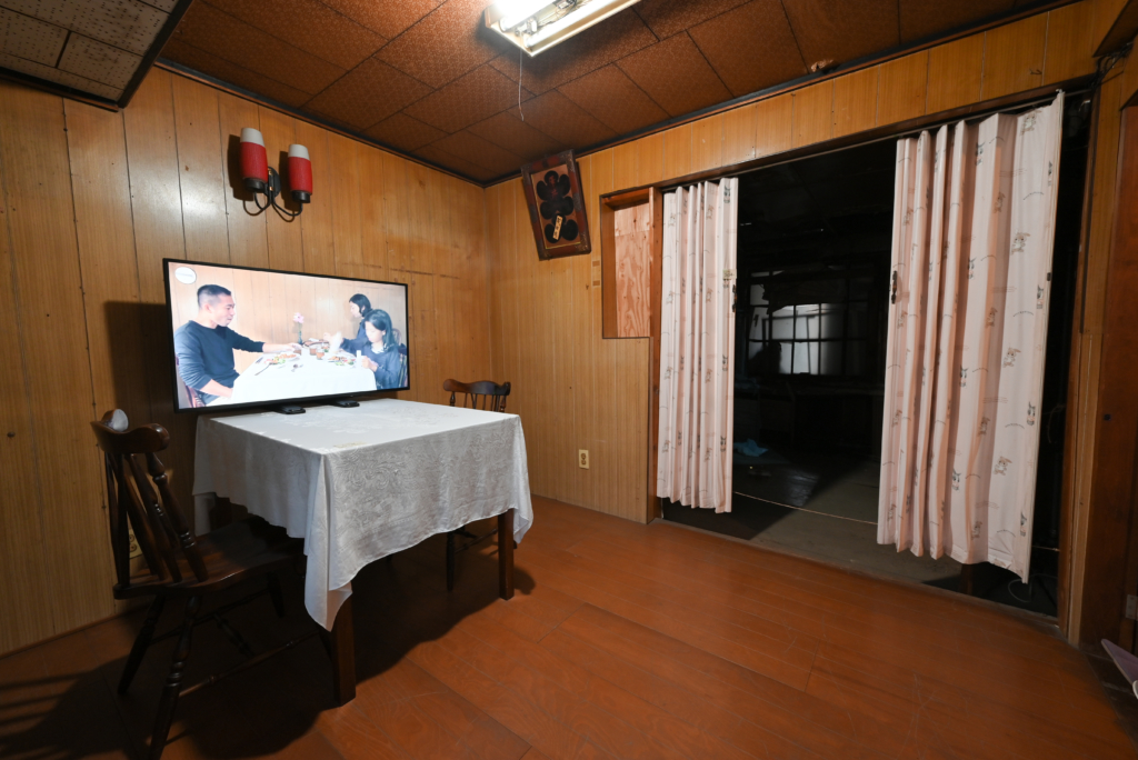 はならぁと2020 企画展覧会 山本聖子 Seiko YAMAMOTO 酔っ払った家と白いテーブルクロス|Drunken houses and a white tablecloth2020映像、使われていない家、テーブル、椅子、ミニチュア家具、テーブルクロス、モニター、プロジェクターvideo work,... -